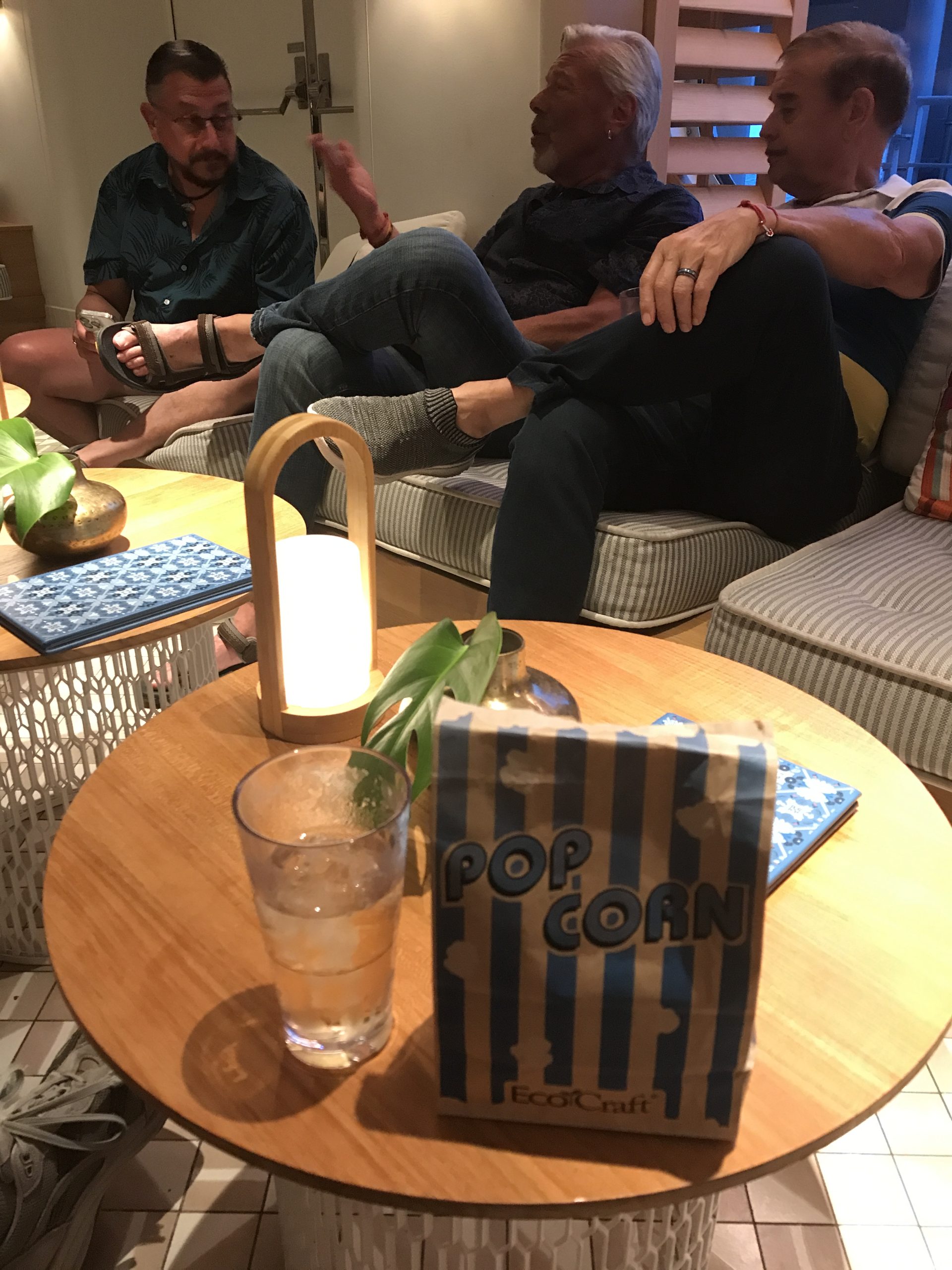 I love some salty treats when I’m drinking, so I grabbed a bag of popcorn on the way down from the champagne party to our cocktail hour. As the cocktail hour comes to a close, our fabulous cruise director, Al, starts rounding us up in groups of 4-6 to head down to tonight’s dinner restaurant.
