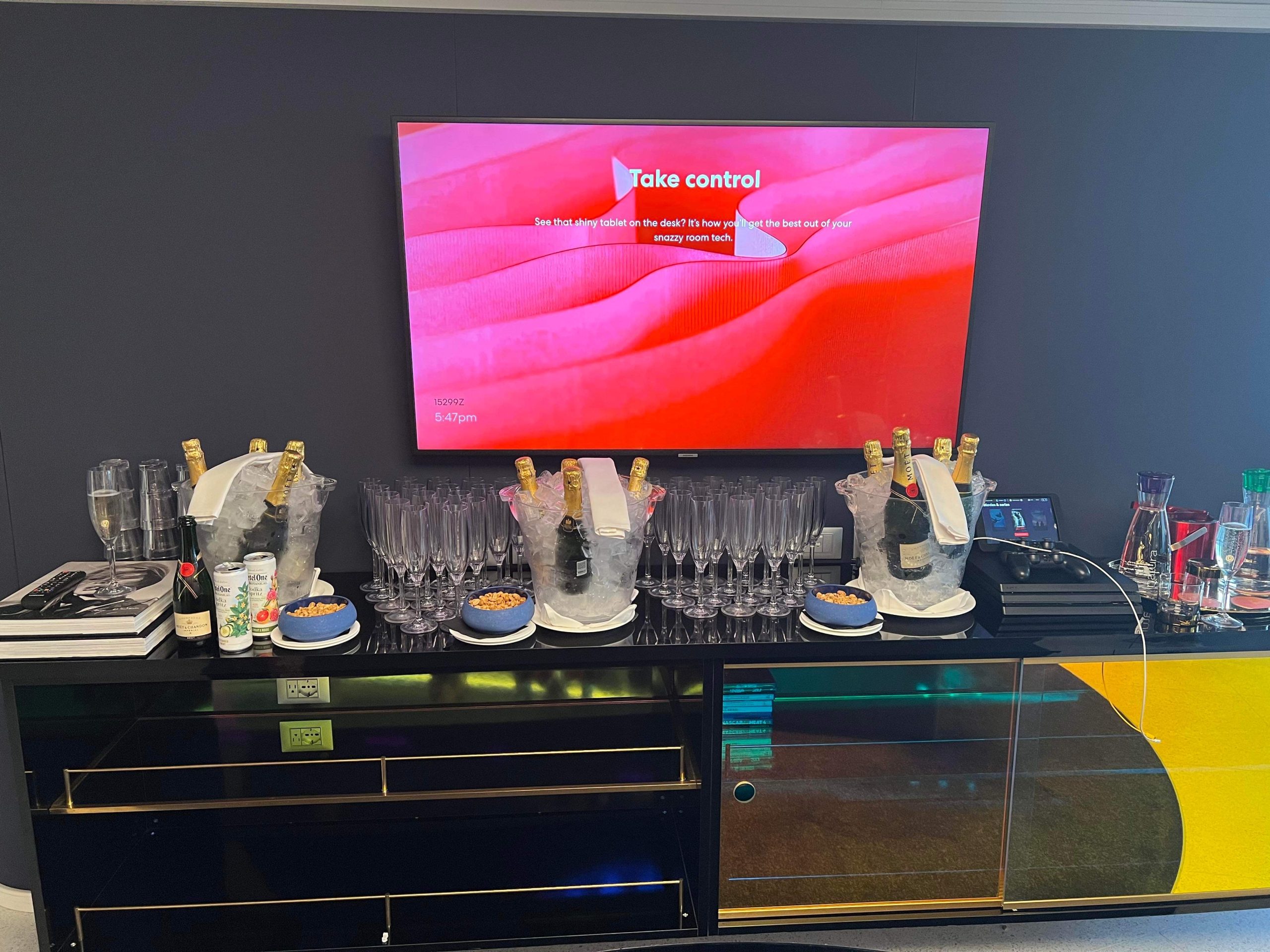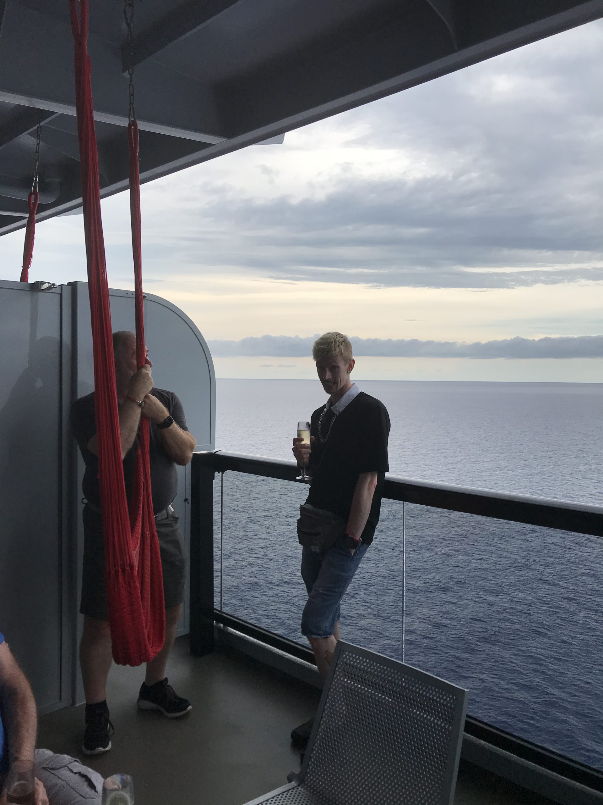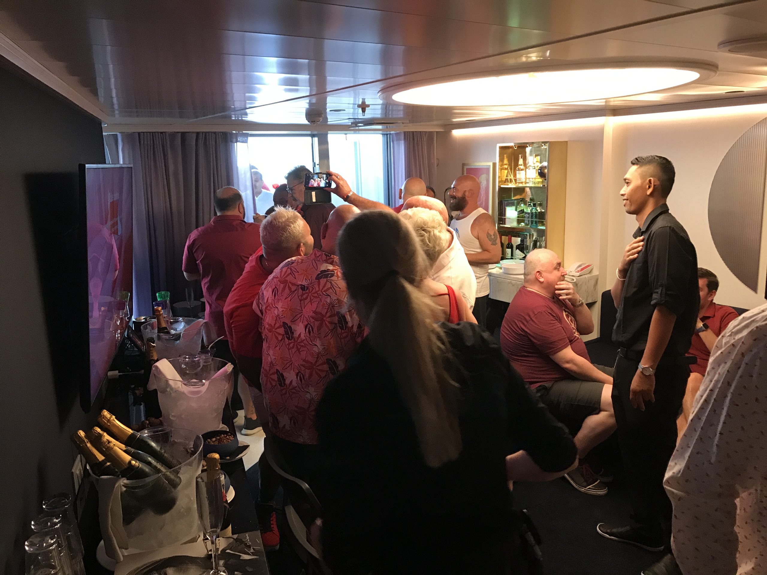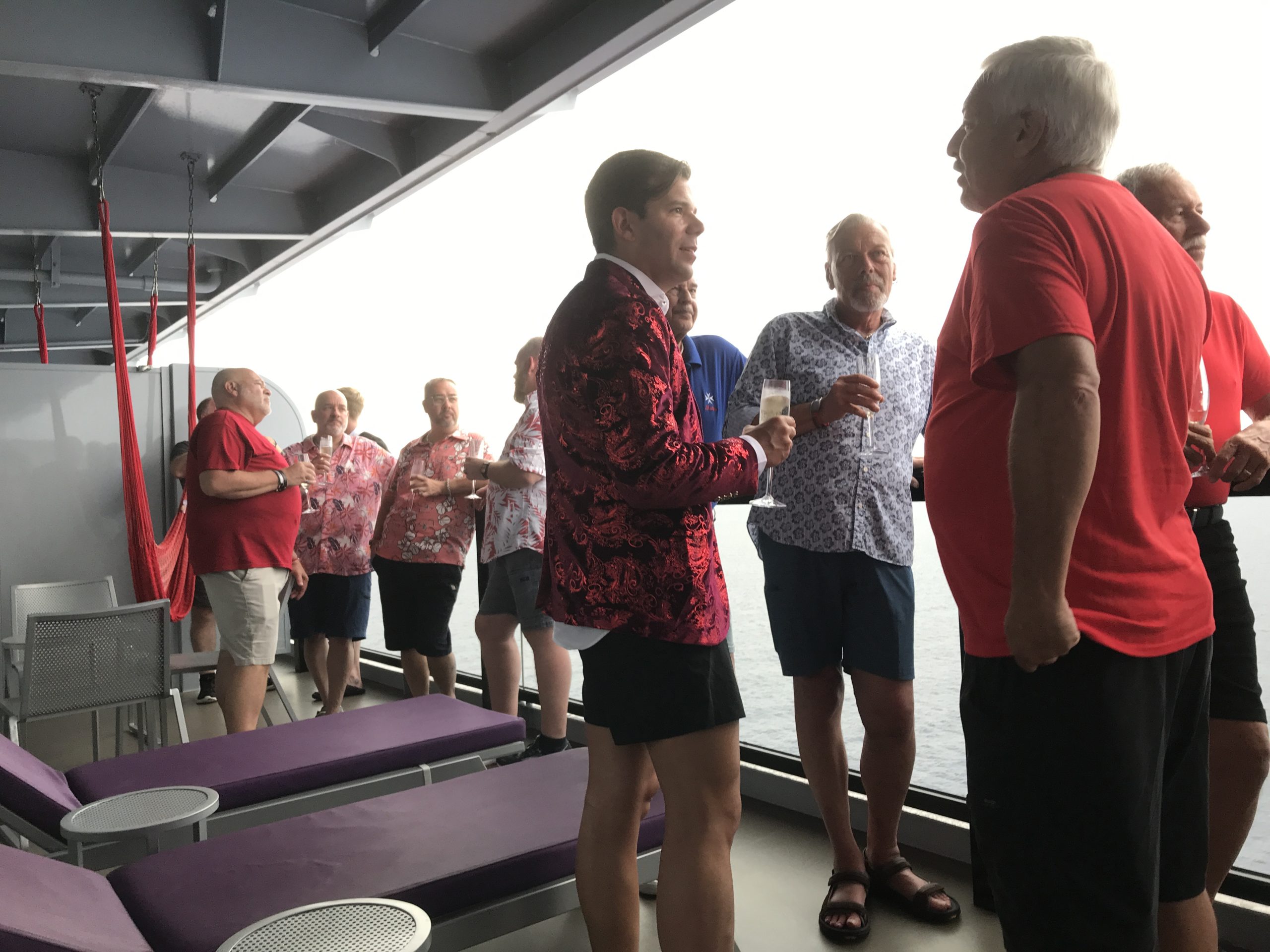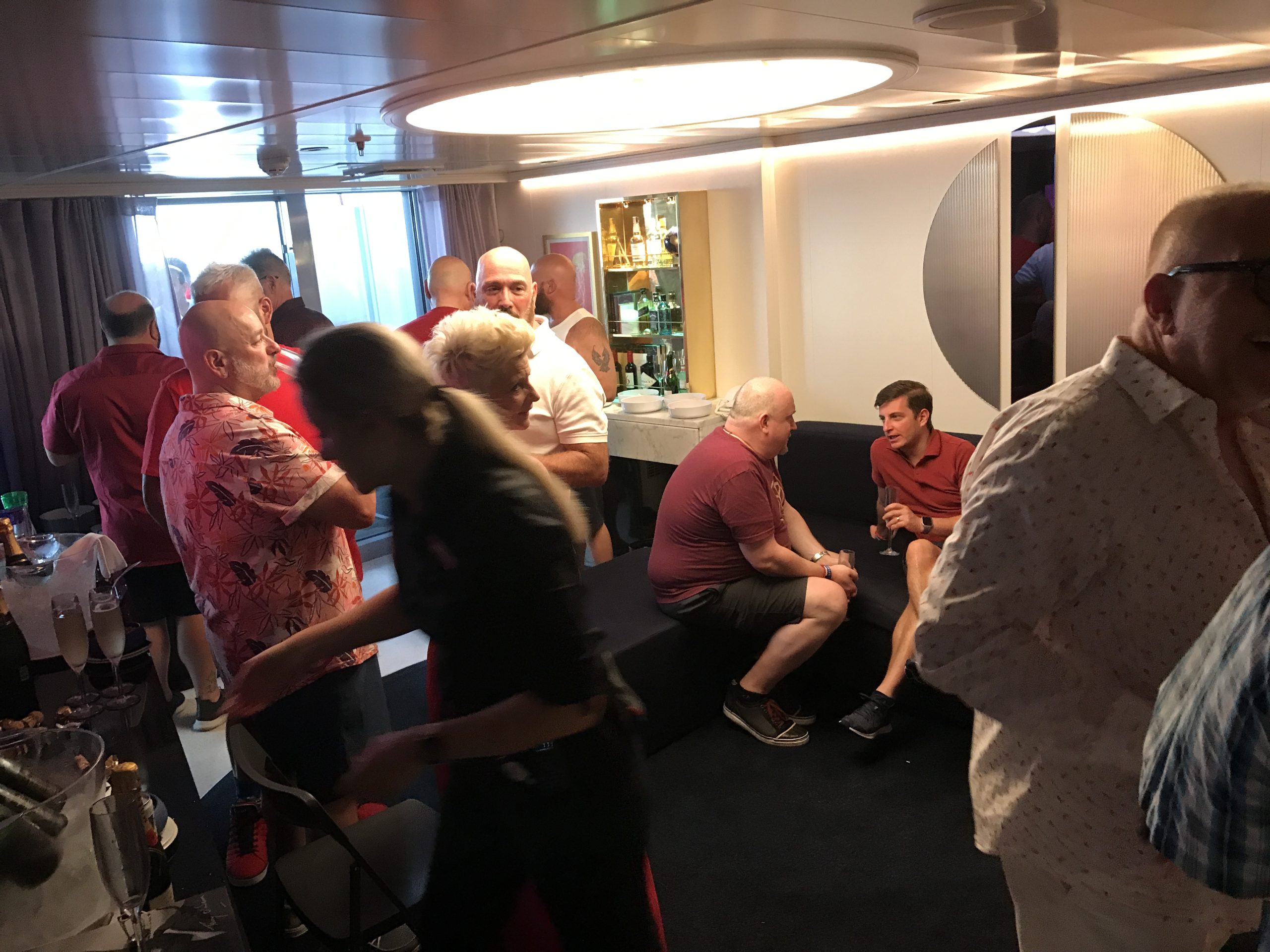 Two guys in our group had one of Virgin Voyages “Rockstar Suites,” and they hosted this champagne party inviting everyone in our group. It was a beautiful suite with a separate bedroom area and 3 sliding glass doors that opened onto a massive deck. Champagne was out when we arrived and within minutes it started flowing as more and more of our group poured in. And our hosts were as nice as they were generous.